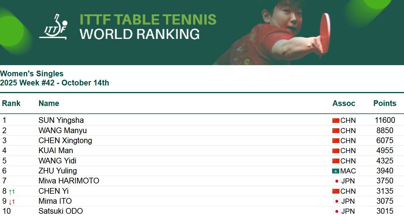 10月14日,国际乒联更新了2025年第42个星期天的世界排名。与女子搭档,孙颖哈早前以11600分连续170周排名,王玛努以8850分排名第二,陈以6075分排名第二。男单方面,王楚钦以10900分排名第一,林诗栋以8075分排名第二,雨果以6050分排名第三。