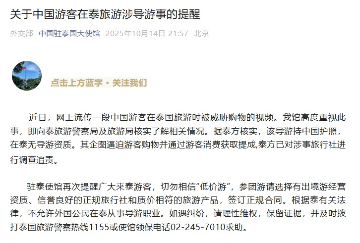 中国驻泰国使馆官方账号截图↑14日,中国驻泰国使馆就中国游客前往泰国旅游相关事项发出警告:近日,一段中国游客在泰国旅游购物时受到威胁的视频在网络流传。我使馆高度重视此事,已向泰国旅游警察和旅游局确认相关情况。据泰方核实,该导游持有中国护照,在泰国没有导游资格。它试图强迫游客购物,并从游客的消费中赚取佣金。泰国对旅行社进行检查并追究责任。驻泰国使馆再次提醒赴泰游客不要轻信“低价游”。团体旅游请选择具有合格旅游经营资质、信誉良好的正规旅行社和旅游产品确认质量和价格相匹配,并签订正式合同。根据泰国相关法律,外国人不得在泰国从事导游职业。如遇到纠纷,请合理维权,保留证据,并及时拨打泰国旅游警察热线1155或使馆领事保护热线02-245-7010寻求帮助。据媒体报道,10月13日,有网友发布一段视频,声称在泰国旅游时遭遇强制消费。导游一脸得意的点头行为,并威胁中国游客“不花钱就回不了中国”、“到了免税店就不能上车”。他还指着拍摄者要求“删除视频”。来源:中国驻泰国大使馆、人民网、红星新闻